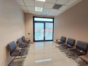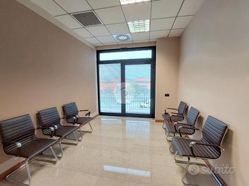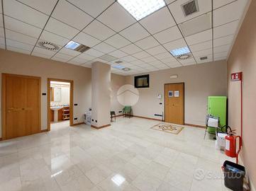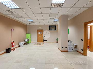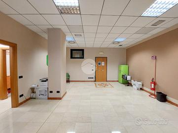 Gli uffici sono posizionati al primo piano, con accesso dalla zona interrata del parcheggio e/o dal piano terra con elegante vano scale coperto completamente in marmo, e possibilità di utilizzare l'ascensore che collega tutti i tre livelli del complesso (ora inattivo).