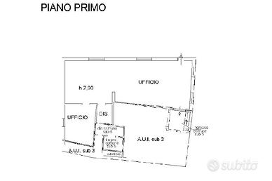 - Piano primo: una superficie di circa 120 mq con annesso l'ingresso dalla strada comunale, tre locali direzionali, disimpegni e servizio igienico.