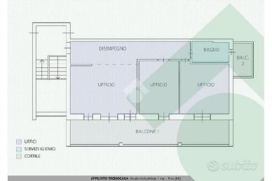L'UFFICIO di 80 mq si trova al primo piano e si divide in tre locali con divisioni in muratura in buone condizioni. Finestre in alluminio con doppi vetri e tapparelle. Porte in legno. Pavimento in ceramica. 2 Balconi. È presente il servizio igienico con vasca da bagno. Dotato di tutti i principali IMPIANTI: illuminazione, elettrico, telefonico, citofono e riscaldamento autonomo.