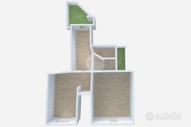 L'immobile è dotato di doppio ingresso e si compone di due vani frontali ampi e luminosi, un terzo vano leggermente più piccolo, un cucinino eD un bagno completo di doccia.