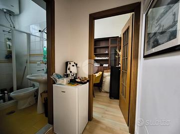 L'ufficio è composto da due ambienti, disimpegno e bagno. L'affaccio è interno, con finestre alte che garantiscono buona luminosità e riservatezza.
