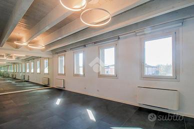 La soluzione proposta in locazione dispone di una superficie di circa 130 metri quadrati interamente disposta al piano primo. Lo spazio si presenta suddiviso in due stanze. L'immobile è completo degli impianti elettrico, di illuminazione, di riscaldamento e di condizionamento; sono inoltre presenti due servizi igienici privati.