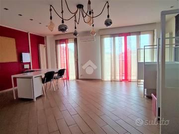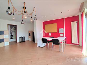 L'immobile è attualmente suddiviso in ingresso, disimpegno, due vani operativi molto grandi, bagno finestrato e terrazzo perimetrale che garantisce luminosità e sfogo esterno agli ambienti.