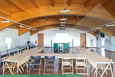 MANSARDA: di 200 mq diviso in due locali di cui un ampio open space usato per sala riunioni completamente ristrutturato con parquet e arcate in legno a vista; riscaldamento e raffrescamento autonomo a pavimento con illuminazione a led, una seconda sala riunioni, locale mensa, locale archivio e servizi igienici.