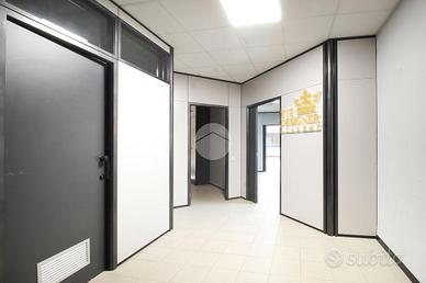 La soluzione internamente è suddivisa con ingresso su locale ricezione, troviamo diverse stanze ad uso ufficio, una grande sala riunioni e bagno.