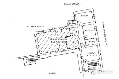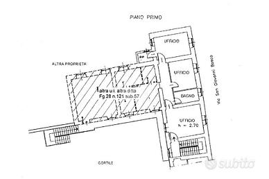 La proprietà è una unità immobiliare ad uso ufficio, sita al primo piano di un edificio condominiale disposto su tre piani fuori terra, oltre e una porzione immobiliare adibita a box auto all'interno di un'autorimessa privata disposta su un piano fuori terra, situata in prossimità del suddetto edificio. I fabbricati sono situati in prossimità del centro storico del comune di San Benigno Canavese.