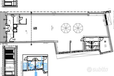 L'ufficio si trova in Piazza XXVII Ottobre, una delle piazze principali che caratterizzano il centro della città; l'ubicazione dell'immobile, grazie alla vicinanza a tutti i mezzi di trasporto (tram, autobus ed eventuale stazione FS), permette di raggiungere in una decina di minuti il centro storico di Venezia inoltre saranno molto comodi i collegamenti anche con città vicine quali Padova e Treviso a pochi metri troviamo anche il centro commerciale "COIN", uno dei più antichi e storici di Mestre. La soluzione sino ad ora è stata un istituto di credito quindi all'ingresso vi sono le classiche porte di accesso a bussola cilindriche, varcate le quali si estende d'innanzi a noi per una metratura di 345mq dove si possono creare delle postazioni con scrivania già parzialmente contrassegnate. Successivamente attraverso un vano interno ai locali si accederà ai due spazi ove sono collocati i bagni finestrati con relativo antibagno; è presente anche una porta interna che dai vani principali ci condurrà nel locale destinato alla centrale di controllo con rete dati cablata, contatori elettrici, riscaldamento e condizionamento. Gli ampi spazi offerti e la centralità della zona favoriscono l'uso dello spazio commerciale anche per aziende che necessitino di un locale ad uso dirigenziale, di una sala riunioni o attività che possano giovare grazie alle ampie vetrine di una notevole visibilità.