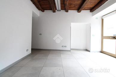 L'ufficio misura circa 25 metri quadrati ed è situato al piano terra di una palazzina che si sviluppa su tre livelli. La soluzione è attualmente un open space ed è dotata di un servizio igienico privato. L'ambiente risulta particolarmente luminoso grazie a una grande vetrina. Il locale possiede l'impianto di riscaldamento a stufa, l'impianto elettrico e quello di illuminazione.