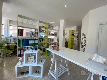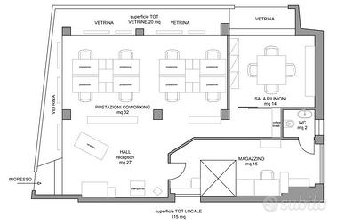 Il locale è tutto vetrato a piano terra, si presenta con una reception-hall di accoglienza, un'area di lavoro con 8 postazioni in open space e una sala riunioni riservata condivisa.