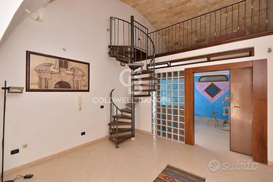 Una scala a chiocciola conduce ad un comodo soppalco che rappresenta un'ulteriore postazione di lavoro.