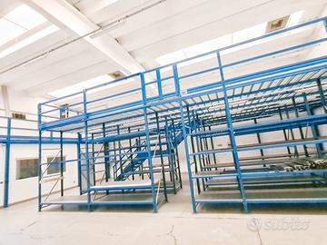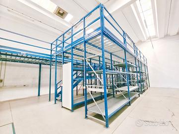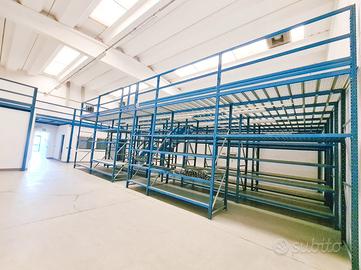 Una robusta scaffalatura metallica suddivide ed organizza lo spazio oltre a sostenere un soppalco di circa 190 mq che aumenta notevolmente la capacità di stoccaggio.