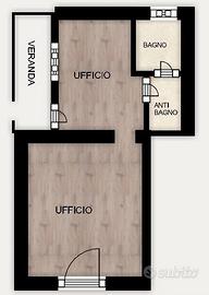 La superficie catastale è di 54 mq, composto da due locali, antibagno, bagno finestrato e veranda. In base all'attuale conformazione, lo spazio potrebbe essere utile per creare due aree di lavoro. La soluzione ha una doppia esposizione, Via Alessandro Volta e Via Pacinotti offrendo visibilità e la possibilità di avere due ingressi da entrambe le vie. Viene venduto completo di arredi.