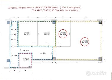 Si tratta di una porzione di ufficio con spazi comuni da condividere con altri due professionisti, trattasi dei locali contraddistinti dal numero 2 nella planimetria.