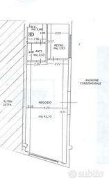 La suddivisione interna presenta un grande ambiente con ampia vetrina sulla via Matteotti, un retrobottega, bagno e antibagno.
