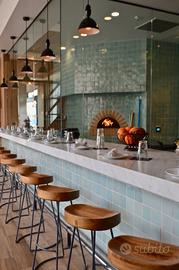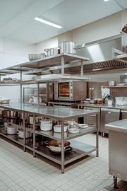 dove troviamo un ampio laboratorio di mq 30 c.a che consente la preparazione di qualunque tipologia di cucina , completamente stigliato dotato di canna fumaria , nel quale è presente un forno elettrico per la pizza Sacar 6 pizze con zona preparazione, friggitrice, cucina a 4 fuochi, abbattitore, piastra, forno ventilato, affettatrice, impastatrice, macchina sottovuoto, lavandini, frigoriferi, congelatori, zona lavaggio e molto altro.