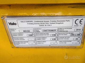 - N.1 Frontale "ROBUSTUS- SE 420 AC" Anno: 2005 Portata: 2000 Baricentro: 500 Tipo montante: TRIPLEX Sollevamento H3 (mm): 4500 Min ingombro H1 (mm): 2100 N° vie distributore: 3 Comandi idraulici: A leve manuali Codice Caricabatteria: R90169 Traslatore assente Cabina aperta vetro Ant+tergi Motore elettrico Forche (mm): 1050 Lettura contatore: 24100 caricabatterie: si Gommatura: Superelastica Singole Matricola: 47898 certificato CE non presente N.1 Stoccatore a colonna con pedana "YALE - MS15X« Anno: 2016 Portata: 1500 Baricentro: 500 Tipo montante: SIMPLEX Sollevamento H3 (mm): 2500 Min ingombro H1 (mm): 2300 N° vie distributore: 1 Codice Caricabatteria: R90188 Motore elettrico Forche (mm): 1150 Lettura contatore: 2938 caricabatterie: si Gommatura: Wullkilan Singole Matricola: C847T03067P certificato CE non presente PRESENTE PREZZO DI RISERVA E OPZIONE "COMPRA SUBITO". IN VENDITA ALL'ASTA DAL 4 AL 5 MAGGIO
