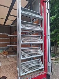 Vendo allestimento Mostra per furgone Semicentinato comprensivo di scala in ferro zincato con gradini antiscivolo scorrevole tramite binario da lato dx a lato sx del cassone più quattro scaffali espositori in ferro zincato con ganci passanti per cinghie ferma carico a crick. L'intero allestimento è removibile ed installabile velocemente in modo tale che quando non serve per mostra sia ha la possibilità di utilizzare nuovamente il cassone per carico merce.