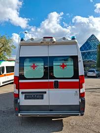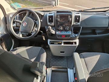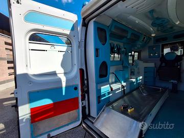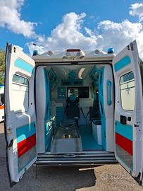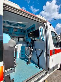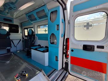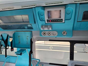 DESCRIZIONE ALLESTIMENTO INTERNO: Vano sanitario composto da tunnel a tetto con aeratore per immissione ed emissione aria, climatizzatore automatico canalizzato a tetto, mancorrente e luci spot a LED; paratia tra cabina di guida e vano passeggeri dotata di finestrella apribile manualmente. Sedile testa barella con seduta richiudibile, poggiaschiena e cintura pretensionata. Alloggiamento per sedia portantina in paratia lato destro. Vano sopra alla cabina di guida per contenimento materiale. Interni in policarbonato lavabili e igienizzabili. Pavimento idoneo al lavaggio con acqua corrente. Predisposizione lato barella per il contenimento di dotazioni sanitarie ed elettromedicali, cassettiera in policarbonato a 4 cassetti. Sedile lato destro richiudibile e dotato di cinture pretensionate. Panca doppia lato destro con gavone, poggiaschiena e cintura pretensionata. N.4 prese da 12v, N.3 prese da 220V e 1 presa per termoculla.