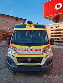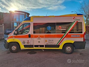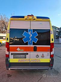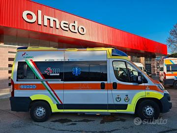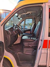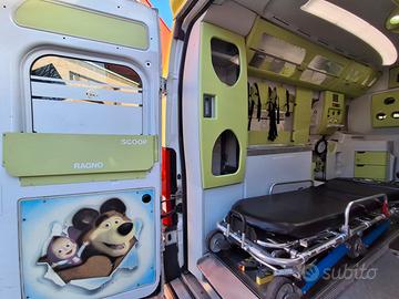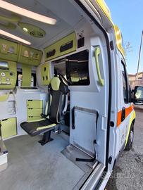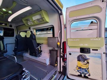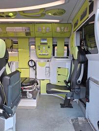 DESCRIZIONE ALLESTIMENTO INTERNO: Vano sanitario composto da tunnel a tetto con aeratore per immissione ed emissione aria, climatizzatore automatico canalizzato a tetto, mancorrente e luci spot a LED; paratia tra cabina di guida e vano passeggeri dotata di porta apribile elettricamente. Sedile testa barella con seduta richiudibile, poggiaschiena e cintura pretensionata. Alloggiamento per sedia portantina in paratia lato destro. Vano sopra alla cabina di guida per contenimento materiale. Interni in policarbonato lavabili e igienizzabili. Pavimento idoneo al lavaggio con acqua corrente. Predisposizione lato barella per il contenimento di dotazioni sanitarie ed elettromedicali, cassettiera in policarbonato a 4 cassetti, vano caldo e vano frigo. Sedili lato destro richiudibile e dotato di poggiaschiena e cintura pretensionata. N.4 prese da 12v, N.1 prese da 220V e 1 presa per termoculla.