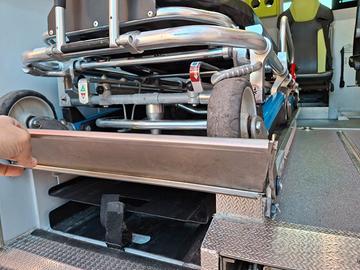 PARTICOLARITÁ: Supporto barella a due vani STEM. Barella Ferno 26 PROFlexx. Gradino laterale elettrico. Pedana idraulica per carico\scarico sedia posteriore.