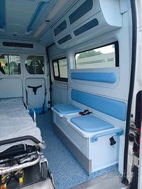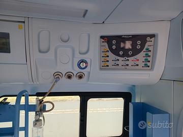 ALLESTIMENTO INTERNO: Vano sanitario composto da tunnel a tetto, e mancorrenti; paratia tra cabina di guida e vano passeggeri dotata di vetratura apribile scorrevole con poltrona fronte marcia dotata di poggiatesta e cintura pretensionata, supporto per scatole porta-guanti in paratia. Interni lavabili e igienizzabili, pavimento idoneo al lavaggio con acqua corrente. Lato sinistro barella mobile personalizzato idoneo per il contenimento di dotazioni sanitarie ed elettromedicali, supporti per caschi protettivi su porta battente sinistra . Doppia seduta lato destro della barella dotata di cinture pretensionate. Alloggiamento bombole ossigeno in mobile personalizzato lato anteriore sinistro con ispezionamento interno . Alloggiamento di n. 2 bombole ossigeno portatili lato posteriore panca destra.