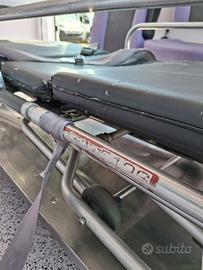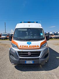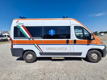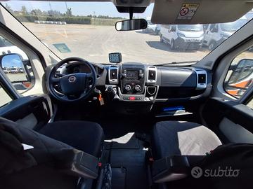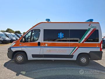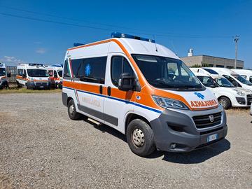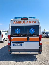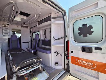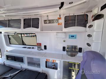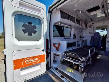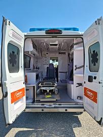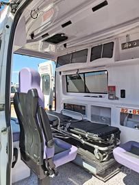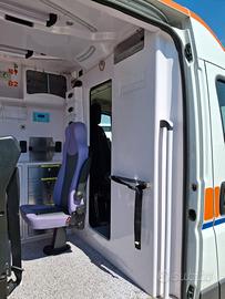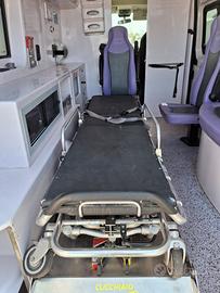 ALLESTIMENTO INTERNO: Vano sanitario composto da tunnel a tetto con areatore per immissione ed emissione aria, climatizzatore canalizzato a tetto; paratia tra cabina di guida e vano passeggeri . Porta tra abitacolo e vano sanitario dotato di porta apribile . poltrona in testata dotata di cintura pretensionata; vano sopra alla cabina di guida per contenimento materiale; lampada scialitica nel tunnel; alloggiamento per sedia portantina lato destro in paratia. Interni in resina lavabili e igienizzabili, pavimento idoneo al lavaggio con acqua corrente; predisposizioni lato barella per il contenimento di dotazioni sanitarie ed elettromedicali; doppia seduta lato destro della barella con schienali imbottiti e cinture addominali per i passeggeri.
