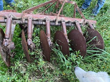 Aratro coltivatore Verdegiglio a sei dischi indipendenti + un disco direzionale posteriore.Frangizolle dotato di ammortizzatori telescopici a molle. Diametro dischi 60 cm e larghezza di lavoro di 160 cm. Attrezzo visibile a Ginosa