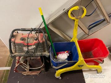 Carrello nuovo con 2 secchi estraibili e mocio + set scopa pulente ad acqua e30 -Navigatori tom tom vari modelli funzionanti e50 al pezzo-Giubotti giallo catarifrangenti nuovi 2e al pezzo-Misuratore laser Leica disto lite nuovo con custodia e180 -