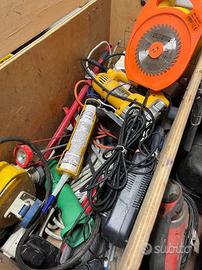Presa multipla industriale 30e di 3 tipi -Quadro mennekes tipo 3938 e100- Radio da cantiere milwakee jsr1218 e90- 2 pezzi carrello per movimentazione veicoli 675kg nuovi monte avena euro 200- sega elettrica colore giallo default modello DW331K euro180e- sega circolare 1010w modello AEG k55 euro 90e- fascio laser a croce nuovo inscatolato con manuale dewalt DW088 e100