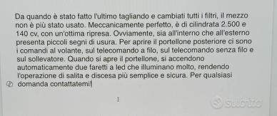 Sul mezzo è stato montato un apri porta pneumatico che permette di aprire e chiudere il portellone tramite un telecomando, un sollevatore a 2 bracci con portata di 350 Kg. ( anche questo azionato dallo stesso telecomando ) all'interno c'è una base girevole a 6 posizioni ( termine tecnico ) e cioè un sediolino che si muove elettricamente tramite dei pulsanti montati sul sediolino stesso, si sposta avanti ed indietro ruota a sinistra ed a destra e si alza e si abbassa ( queste sono le 6 posizioni ). Sono presenti acceleratore e freno entrambi al volante e freno a mano elettronico che viene azionato tramite un pulsante !