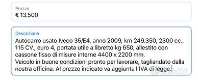 Autocarro usato Iveco 35/E4, anno 2009, km 249.350, 2300 cc., 115 CV., euro 4, portata utile a libretto kg 650, allestito con cassone fisso di misure interne 4400 x 2200 mm. Cambio manuale, portata utile 650 kg.