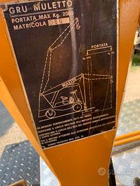 Vendo muletto autogru piccola Funzionante e in ordine come in fotoRaffreddamento ad aria motore slanzi cilindri 1 Apposto di tutto e funzionante No documenti di omologazione ha le sue etichette matricola come in foto Misure Largo 166 H 240Lunga sui 350 portata max kg 2000 come da etichetta allegata in foto (2000 kg sotto chiusa mentre aperta tutta 2,20 m 600 kg) prezzo non trattabile