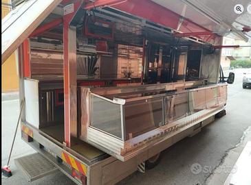 Cassone lungo in totale circa 4.50 metri, largo 2.20 e alto 2.20. Presente banco frigo, gruppo elettrogeno honda 4 kw, lavabo con boiler, cella verticale. Banco da lavoro dietro con scaffalatura. Vendesi per passaggio a furgone leggero.