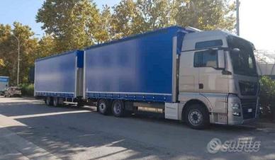 Autotreno Gran Volume Man Tgx 500 LL 2018 Full Optional con clima da fermo, tutto pneumatico, con gommoncini barra 60. Centinato registrabile in altezza, con copri/scopri e porte posteriori in alluminio. Biga omar 200q, caratteristiche come motrice. 650.000km Biga e motrice non comunicanti. Misure: 730 cassone motrice Altezza 3mt luce interna gran volume 38 pallet Rimorchio 830 Chiamare al 3355420613 per altre informazioni
