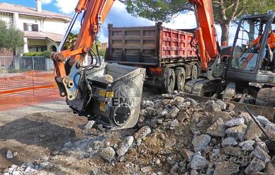 BENNE FRANTUMATRICI per la riduzione volumetrica degli inerti. Per montaggio su braccio escavatore completa di: - rotore con denti intercambiabili; - lame smontabili per pezzatura 0-70 mm; - foratura superiore per flangiatura sella di attacco; uscite idrauliche mandata, ritorno e drenaggio, il prezzo si intende per la fornitura base. La nostra linea comprende per escavatore benna, pinza, pedane e rampe da carico, trincia, martello demolitore, trivella idraulica, cingoli, fresa, ruota simex, demolitrice, frantumatrice, forche, fresa ceppi, battipalo, miscelatrice, spazzatrice, cesoia e selezionatrice
