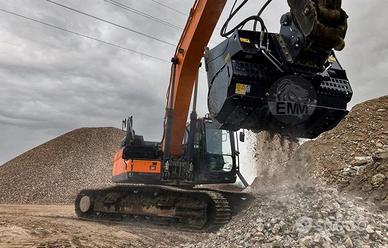 BENNE FRANTUMATRICI per la riduzione volumetrica degli inerti. Per montaggio su braccio escavatore completa di: - rotore con denti intercambiabili; - lame smontabili per pezzatura 0-70 mm; - foratura superiore per flangiatura sella di attacco; uscite idrauliche mandata, ritorno e drenaggio, il prezzo si intende per la fornitura base. La nostra linea comprende per escavatore benna, pinza, pedane e rampe da carico, trincia, martello demolitore, trivella idraulica, cingoli, fresa, ruota simex, demolitrice, frantumatrice, forche, fresa ceppi, battipalo, miscelatrice, spazzatrice, cesoia e selezionatrice