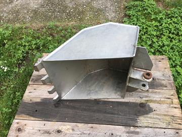 Benna in acciaio per miniescavatore. Larghezza di scavo cm. 40; diametro fori per inserimento perni, cm. 2; larghezza spazio per inserimento braccio dell'escavatore, cm. 8. Prezzo simbolico € 50