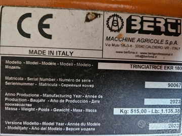 Trincia Berti ekr 180 REVERSIBILE anno 2023 con meno di 10 ore di utilizzo. Utilizzata esclusivamente su erba in parco privato. Utilizzo molto versatile: posteriore,anteriore o con guida retroversa. Vendesi causa inutilizzo .
