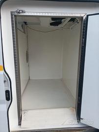 Il camion è provvisto di paratia divisoria tra fresco e congelato con doppio termostato separato e allaccio strada-rete monofase per il frigo.