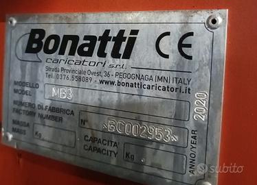 Caricatore marca Bonatti mod. MB3 - anno 2020- completo di forche da balloni e flange- CE- adatto per trattori Lamborghini o Same 4 cilindri di diverse serie- in ottimo stato- pronto all'uso