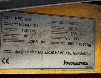 Carrello elevatore frontale Jungheinrich EFG 216 - Anno: 2013 - Portata: 1500kg - Alimentazione: batteria: 48V 750Ah - Ruote: 3 - Montante: triplex - Altezza montante: 2,10 metri - Alzata massima: 4,8 metri - Matricola: FN447491 Visionabile presso la nostra sede: 📍Via Bertinetti 28, Vercelli (VC) Per ulteriori informazioni, foto più accurate e preventivi contattare il numero: 329-8986100