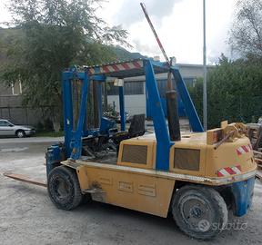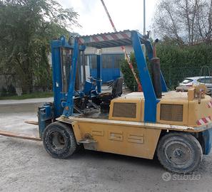 Carrello elevatore usato diesel marca PGS modello DI6500S, telaio numero R0174, anno 1990, accessoriato di traslatore e posizionatore forche, completo di antinfortunistica (cinture, cicalino lampeggiante, fungo di emergenza, et; macchinario in versione standard.