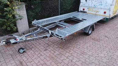 Rimorchio monoasse trasporto auto con pianale basculante e rampe di carico.