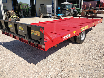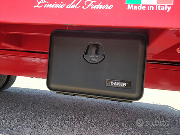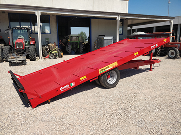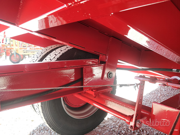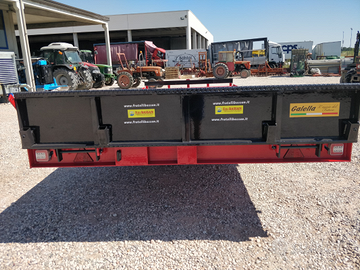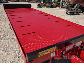 Carrellone Galella 60 qli, lunghezza 6.10 mt estendibile 6.50 mt, larghezza 2.46 mt, portata complessiva 60 Q, tara 23 Q, pneumatici 4 ruote 245/70 R17.5, frenatura idraulica, cassetta porta attrezzi in pvc, piedino con manovella laterale telaio in ferro, freno idraulico con molle di ritorno anti bloccaggio, fanali a LED, assale quadro 80 RINFORZATO, pistone doppio effetto alesaggio 100 con valvola di blocco, pianale rinforzato interamente con tutte doppie traverse laterali e interne per trasporto macchine, 3 verricelli laterali + 2 anteriori, doppi golfari anteriori per bloccaggio pianale.