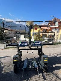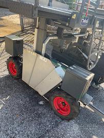 Carro raccolta elettrico munito di 2 motori, 4 batterie ricaricabili nuove, pedana elevabile elettricamente fino a 2 mt di altezza, pedana con livellamento elettrico laterale e frontale, kit raccolta frutta con 4 cestelli su 4 posizioni diverse, forche e catene elettriche per carico e scarico fino a 2 bind contemporaneamente, pistone stabilizzatore elettrico per terreni sconnessi e con forti pendenze, regolatore velocità di avanzamento, avanzamento automatico, console di comando rimovibile, presa tipo accendisigari per ricarica telefono ed apparecchi elettrici (radio). Carrello per trasporto su strada omologato. Certificazione, omologazione es iscrizione agli enti preposti.