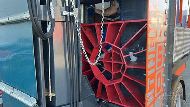 Impianto per legna da ardere su ruote. Max capacità di taglio 70 cm Max forza di spacco 50 ton Con catenaria 3 catene Nastro trasportatore 6 metri largo 1 metro 2 griglie di spacco montate sul telaio e mobili in 4 direzioni.