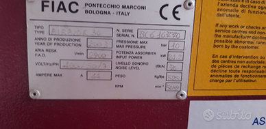 Vendo compressore a vite marca Fiac modello Airblock 30 silenziato. Anno 2003. Aria resa 2.900 litri al minuto. Pressione massima 10 bar. Potenza assorbita 24,2 kw. Tensione trifase 380 volt. Prezzo netto i.e.. Per info Mostra numero Mostra numero