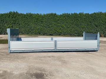 TITOLO: CONTAINER NUOVO A PIANALE CON PIANTONI RIMOVIBILI IN FERRO E DUE SPONDE PER LATO IN TR5 E SPONDA POSTERIORE IN FERRO A 3 EFFETTI A LIBRO, RIBALTABILE VERSO L'ALTO E RIBALTABILE VERSO IL BASSO CON FONDO MANDORLATO E TRAVI IN APPOGGIO DA 200 MM CON 2 GANCI DI ANCORAGGIO INTERNI A SCOMPARSA