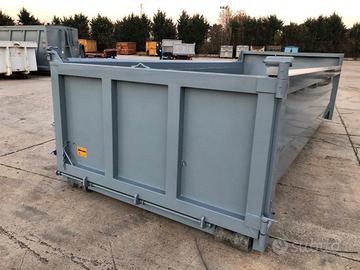 CONTAINER PER INERTI APERTO CON PORTA POSTERIORE UNICA APERTURA ANTA RIBALTA - VASCA DI ROCCIA. Adatto a caricare anche scavatori Container di forma arrotondata rinforzata con gancio maggiorato da 60 mm , rinforzo nel punto di snervatura parte anteriore, travi da 200 mm rinforzate nella parte centrale (punto di scarramento), ruote posteriori maggiorate. Fondo in appoggio alle travi con mensole laterali di supporto.