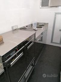 Lavello con acqua calda e fredda; lavastoviglie; 2 gruppi di pensili; generatore da 22 kw; serbatoio d'acqua potabile da 350 litri; serbatoio di acqua reflua da 350 litri; congelatore verticale; Autoclave con boiler elettrico; Scaffalatura per materie prime; Garage per eventuale sccoter o wc mobile con lavamani.